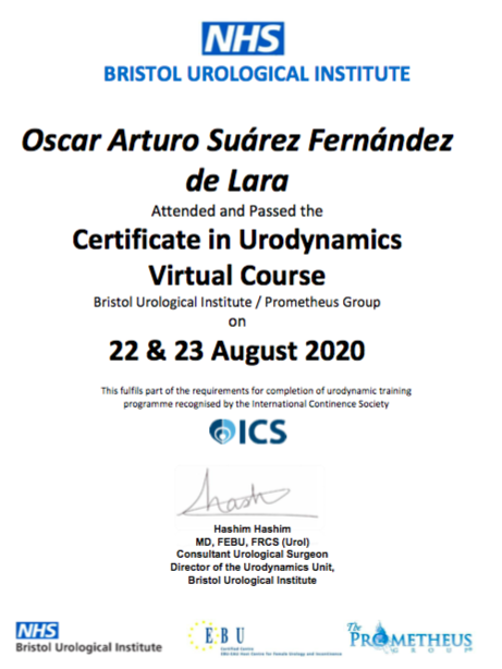 La educación continua es el pilar de una Urología de calidad. Por eso, comprometido con los más altos estándares de Urología Internacional he completado exitosamente un curso más: Certificado en Urodinamia por el Bristol Urological Institute, la institución pionera y más prestigiosa en el mundo de la Urodinamia. Con este certificado aseguramos a nuestros pacientes que los estudios urodinámicos realizados por el Dr. Oscar Arturo Suárez cumplen con los estándares de calidad establecidos por la Sociedad Internacional de Continencia.